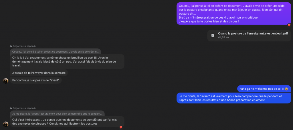 Une fois notre travail terminé, nous ne pouvions plus reculer, il fallait que l’experte Dominique Bucheton jette un œil à notre squelette d’une séance ludopédagogique. Cela fut très enrichissant et nous a permis de nous conforter dans notre compréhension des postures mais parfois cela nous a donné des perspectives différentes.
